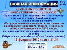15 февраля 2017 года в 11:00 по московскому времени руководитель Федеральной службы по надзору в сфере образования и науки проводит Всероссийскую встречу с родителями по вопросам проведения государственной итоговой аттестации по программам основного общего и среднего общего образования в 2017 году.