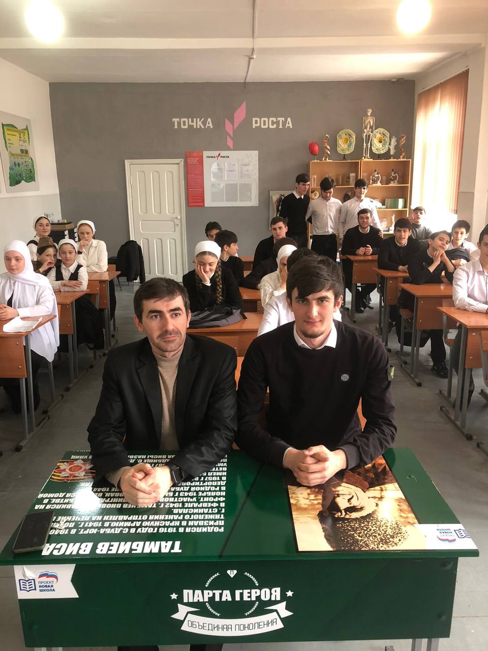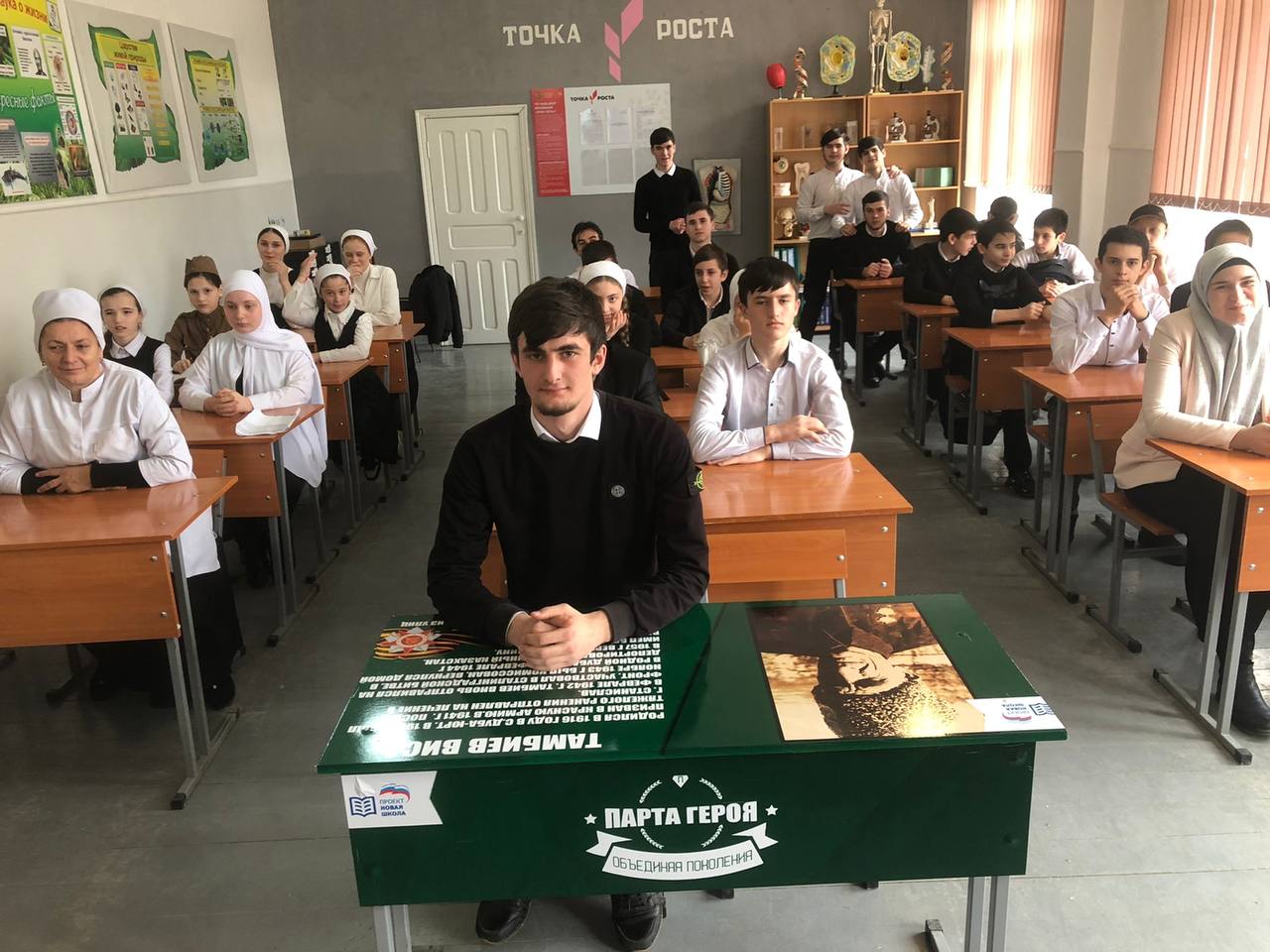Так же в канун Дня Защитника Отечества в школе прошла церемония открытия Парты Героя. Право сидеть за Партой Героя будет предоставлено лучшим ученикам. Права первым сесть за Парту Героя удостоился ученик 11 класса Муцаев Магомед.