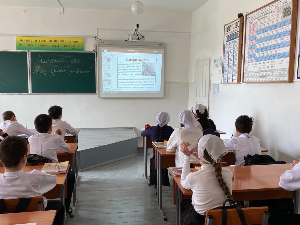 19 апреля в рамках Всероссийского дня единых действий в нашей школе проведены уроки «Без срока давности». Единый урок «Без срока давности» направлен на сохранение исторической правды о преступлениях нацистов и их пособников в отношении мирных граждан нашей страны в годы Великой Отечественной войны.