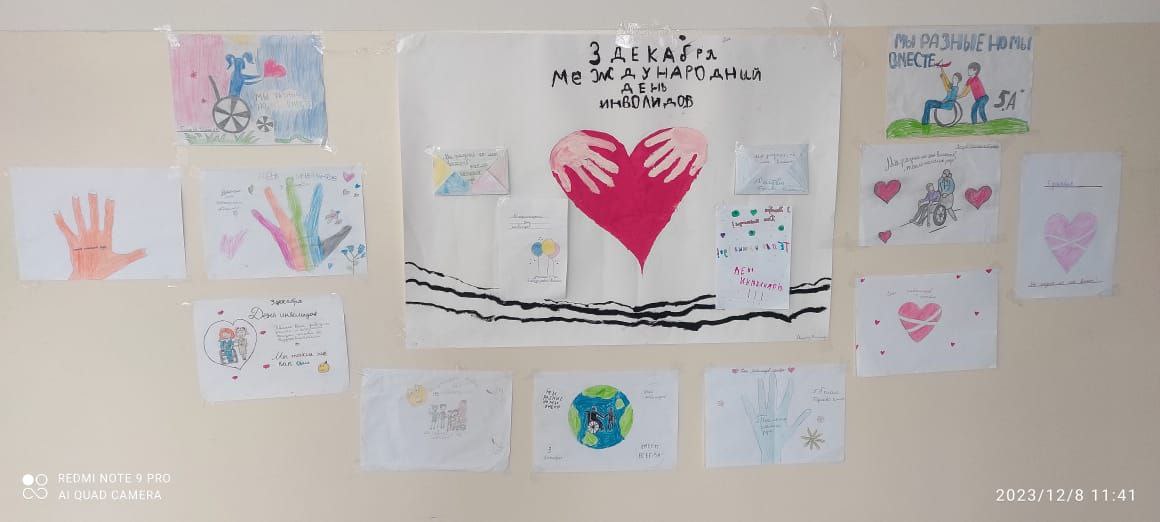 08.12.2023В честь Дня инвалидов в нашей школе с 3 по 8 декабря проведена Неделя добра. В рамках Недели в классах прошли классные часы с показом презентаций на тему "3 декабря-Всемирный день инвалидов ","Вместе мы можем больше ".Проведена выставка рисунков "Мы разные, но мы вместе ".С целью демонстрации тёплого, гуманного отношения к детям с ограниченными возможностями здоровья учениками проведена акция "Тепло наших рук ".Целью проведения данных мероприятий было привлечь внимание учащихся к проблемам людей с ограниченными возможностями здоровья, развить в детях чувство сострадания.