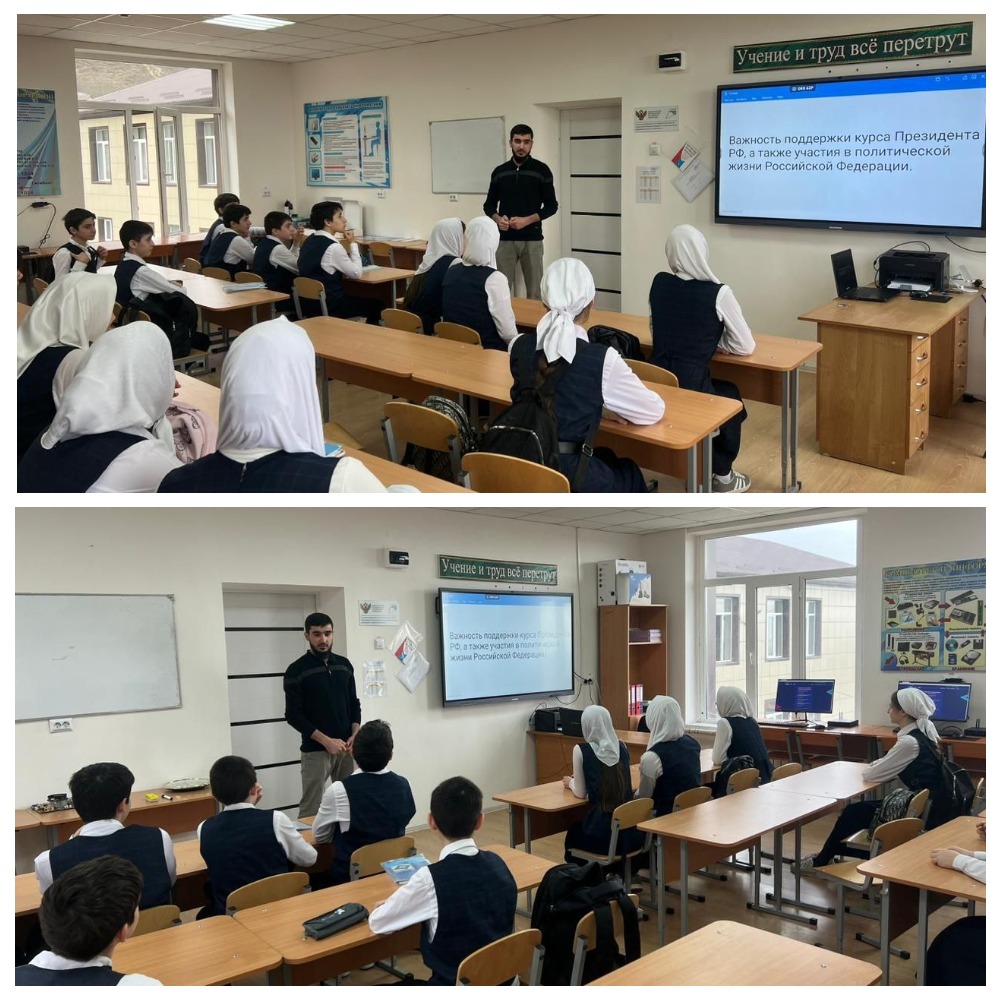 22.03.2024Отделом в Шалинском районе УФСБ России по Чеченской Республике совместно с МУ «Отдел образования Шалинского муниципального района Чеченской Республики» проведено профилактическое мероприятие в МБОУ "СОШ с. Дуба-Юрт" на тему: «Важность поддержки курса Президента РФ, а также участия в политической жизни Российской Федерации».