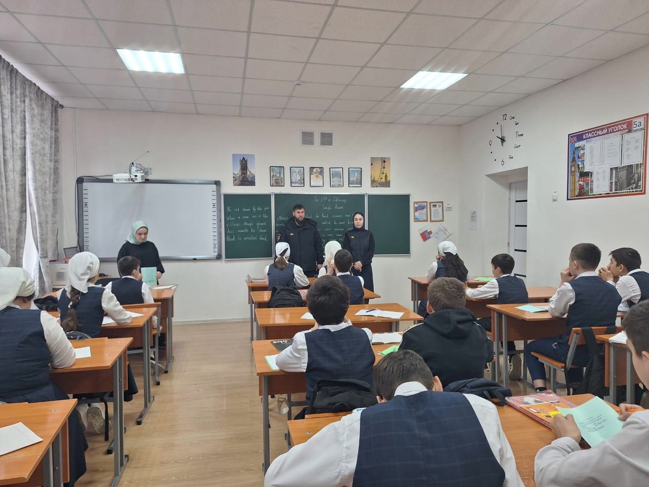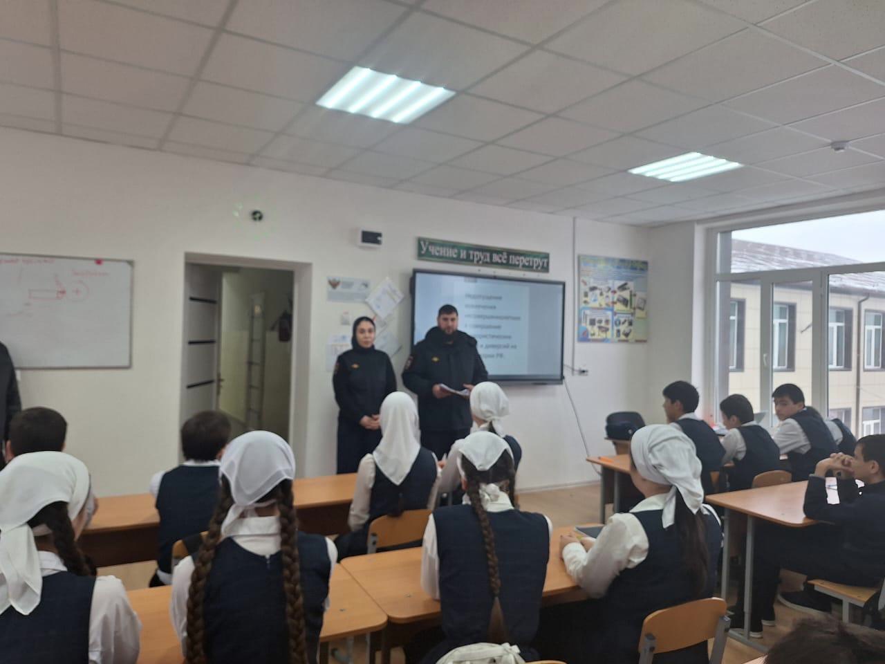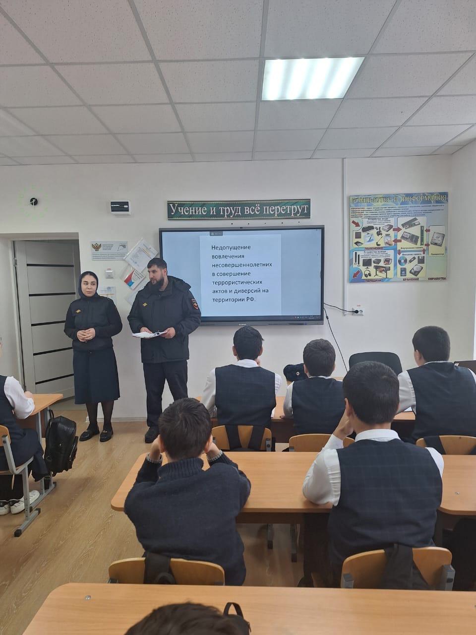 05.02.2025Сегодня в 8-10 классах нашей школы проведена встреча обучающихся с инспекторами ОПДН ОУУП и ПДН ОМВД России по Шалинскому району ЧР старшим лейтенантом полиции Мержоевой Р.Х. и старшим инспектором полиции Пайтаевым З.А. С учащимися была проведена беседа по профилактике терроризма и экстремизма на тему: "Недопущение вовлечения несовершеннолетних в совершение террористических актов и диверсий на территории РФ".